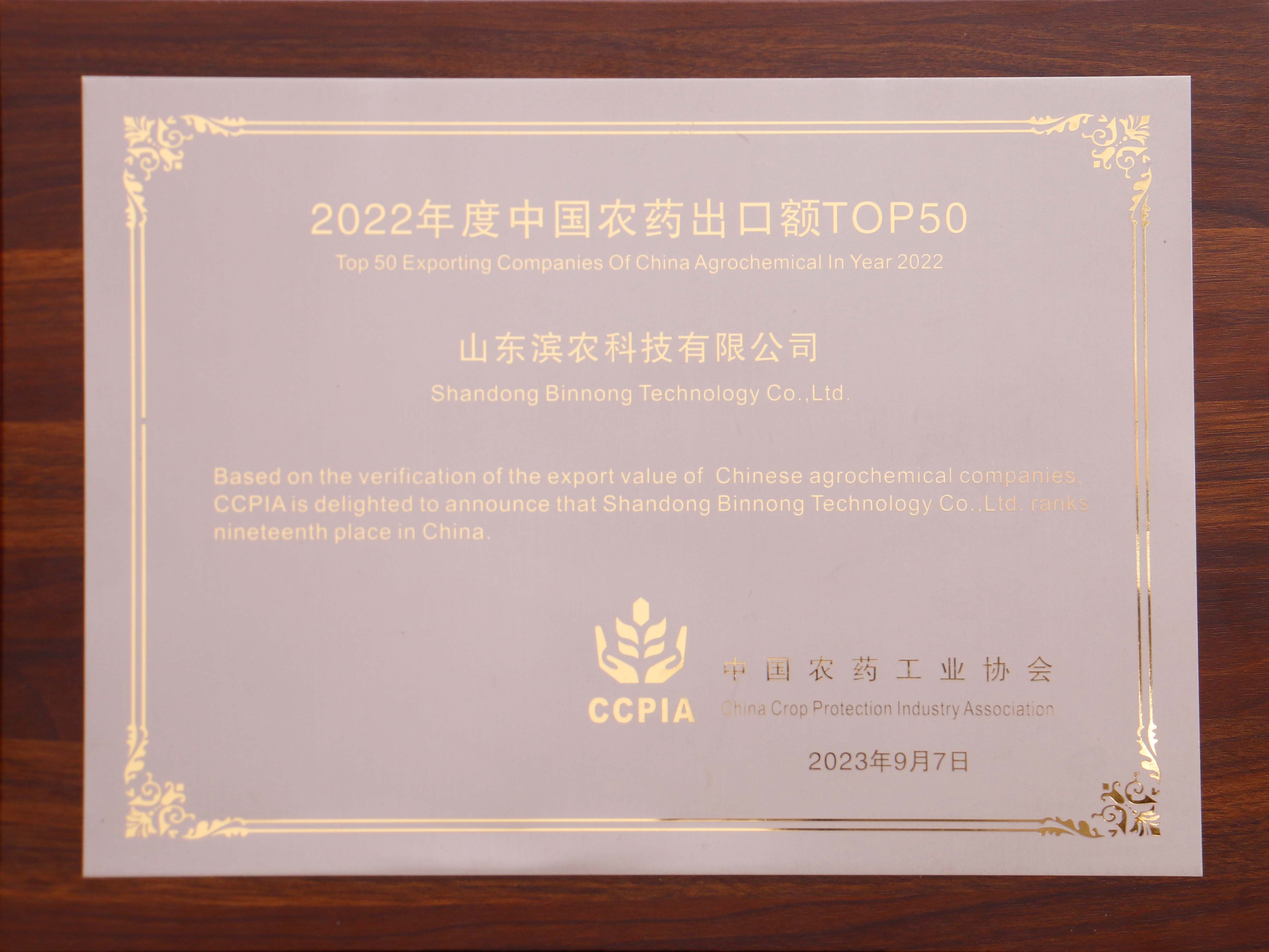 ■2023-10-09 濱農(nóng)科技榮獲2022年度 “中國農(nóng)藥出口額Top 50”第十九名