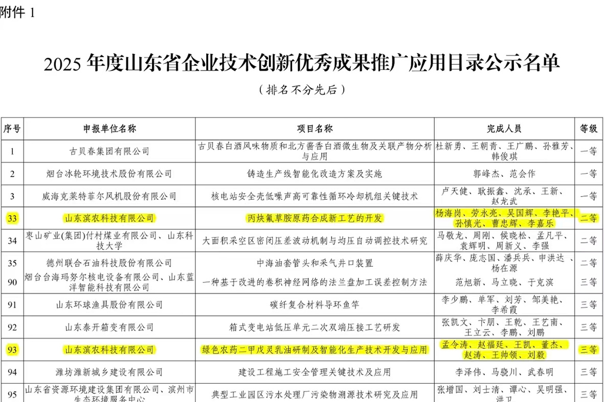 我公司兩項成果斬獲2025年度山東省企業(yè)技術(shù)創(chuàng)新優(yōu)秀成果獎發(fā)布時間:2025-10-14 10:52 9月12日,山東省企業(yè)技術(shù)創(chuàng)新促進會正式公布了2025 年度山東省企業(yè)技術(shù)創(chuàng)新優(yōu)秀成果推廣應(yīng)用目錄,我公司憑借在綠色農(nóng)藥研發(fā)與工藝創(chuàng)新領(lǐng)域的突破成果斬獲兩項省級榮譽——“丙炔氟草胺原藥合成新工藝的開發(fā)”獲評二等獎,“綠色農(nóng)藥二甲戊靈乳油研制及智能化生產(chǎn)技術(shù)開發(fā)與應(yīng)用”榮獲三等獎,彰顯了我公司在技術(shù)創(chuàng)新領(lǐng)域的強勁實力與行業(yè)競爭力。 ![]() |