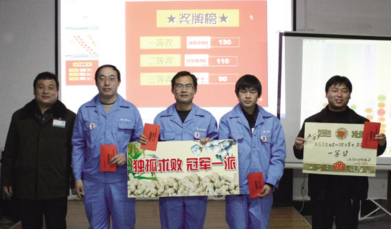 最后,經(jīng)過激烈火爆的比拼,五分廠獨孤求敗隊以130分摘得冠軍,科室二組封殺劈凈隊、二分廠飛翼隊分獲二等獎、三等獎。首屆企業(yè)文化擂臺賽在一片歡騰中圓滿結束,但是各選手仍意猶未盡,期待在下次擂臺賽上再顯身手。