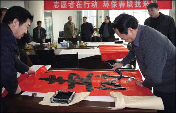 1月29日上午,由濱州市環(huán)保局、環(huán)保協(xié)會(huì)聯(lián)合舉辦,我公司冠名贊助的環(huán)保春聯(lián)有獎(jiǎng)?wù)骷攥F(xiàn)場書寫在我銷售公司三樓會(huì)議室隆重開展。濱州市環(huán)保協(xié)會(huì)邀請我市書法協(xié)會(huì)主席孫樹勛先生等八位書法家,義務(wù)參加“志愿者在行動(dòng),環(huán)保春聯(lián)我來寫”活動(dòng),現(xiàn)場潑墨揮毫,書寫環(huán)保春聯(lián)一百多幅,墨香氤氳的和諧場面,暗合了“青山環(huán)北郭,綠水繞東城”的美好和諧意境。