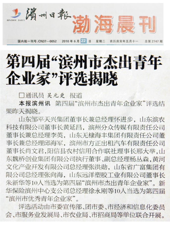 第四屆“濱州市杰出青年企業(yè)家”評選結(jié)果已于6月22日揭曉,我公司董事長黃延昌等10位優(yōu)秀企業(yè)家當選為第四屆“濱州市杰出青年企業(yè)家”。評選活動由市委宣傳部、團市委、市經(jīng)濟和信息化委員會、市服務業(yè)發(fā)展局、市農(nóng)業(yè)局、市招商局等單位聯(lián)合開展。