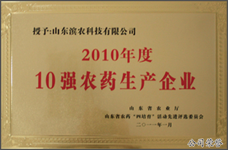 2011年1月21日,山東省農(nóng)藥檢定所召開(kāi)了2011年山東省農(nóng)藥管理工作會(huì)議,會(huì)上山東濱農(nóng)科技有限公司被評(píng)為2010年山東省農(nóng)藥“四培育”活動(dòng)10強(qiáng)農(nóng)藥生產(chǎn)企業(yè)第一名。會(huì)議由省藥檢所所長(zhǎng)楊理健主持,部所和省農(nóng)業(yè)廳領(lǐng)導(dǎo)就農(nóng)藥管理工作分別講話(huà),并為獲獎(jiǎng)單位頒發(fā)獎(jiǎng)牌。山東濱農(nóng)科技有限公司市場(chǎng)總監(jiān)楊希坤代表獲得10強(qiáng)生產(chǎn)企業(yè)作了典型發(fā)言。