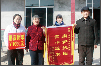 2011年1月24日,人力資源部主任戚哲芬代表公司為東寨子村石承承同學(xué)送去助學(xué)金1000元,并向其家人致以節(jié)日的問候。石承承及家人為感謝公司多年來的照顧,將一面“捐資扶困,雪中送炭”的錦旗送到戚主任手中。石承承表示今后一定好好學(xué)習(xí),不辜負大家的期望,學(xué)有所成后,志愿投身到公司的發(fā)展建設(shè)中,為濱農(nóng)盡一份自己的綿薄之力。